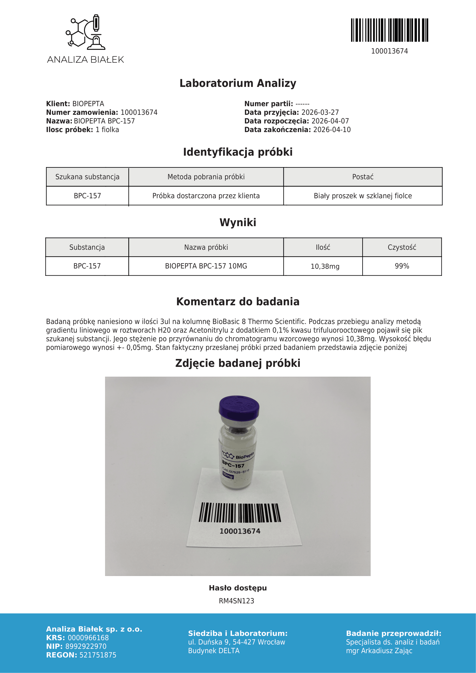 Wyniki badania dostępne są w grafikach produktu oraz w dedykowanej sekcji Badania. Autentyczność raportu można zweryfikować na stronie analizabiałek.com/wyniki, wpisując numer zamówienia i hasło dostępu widoczne na raporcie.